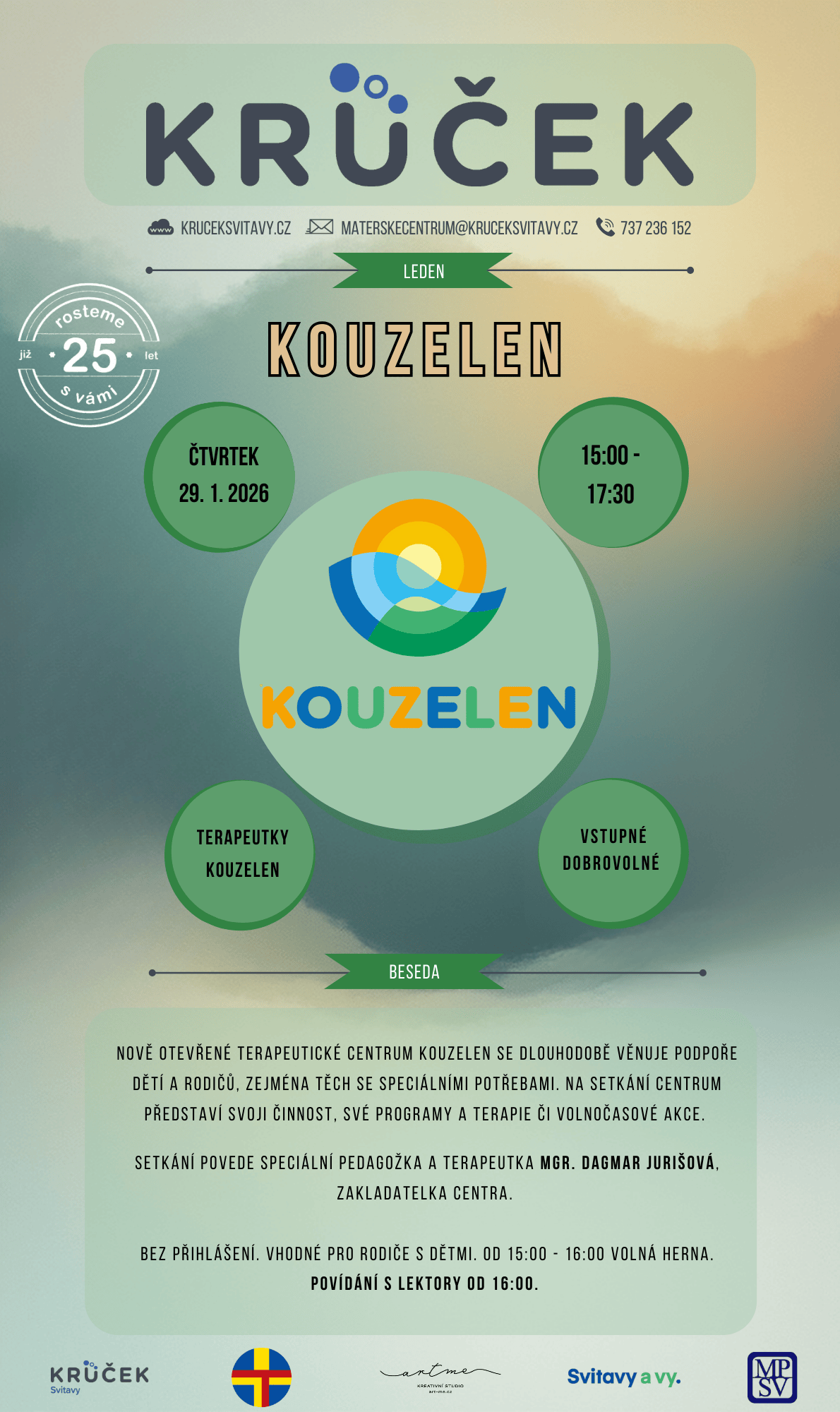 Na semináře je nutno se předem hlásit na e-mail materskecentrum@kruceksvitavy.cz. U mnohých vzdělávacích akcích poskytujeme i možnost hlídání dětí. Informace naleznete na letáčcích.