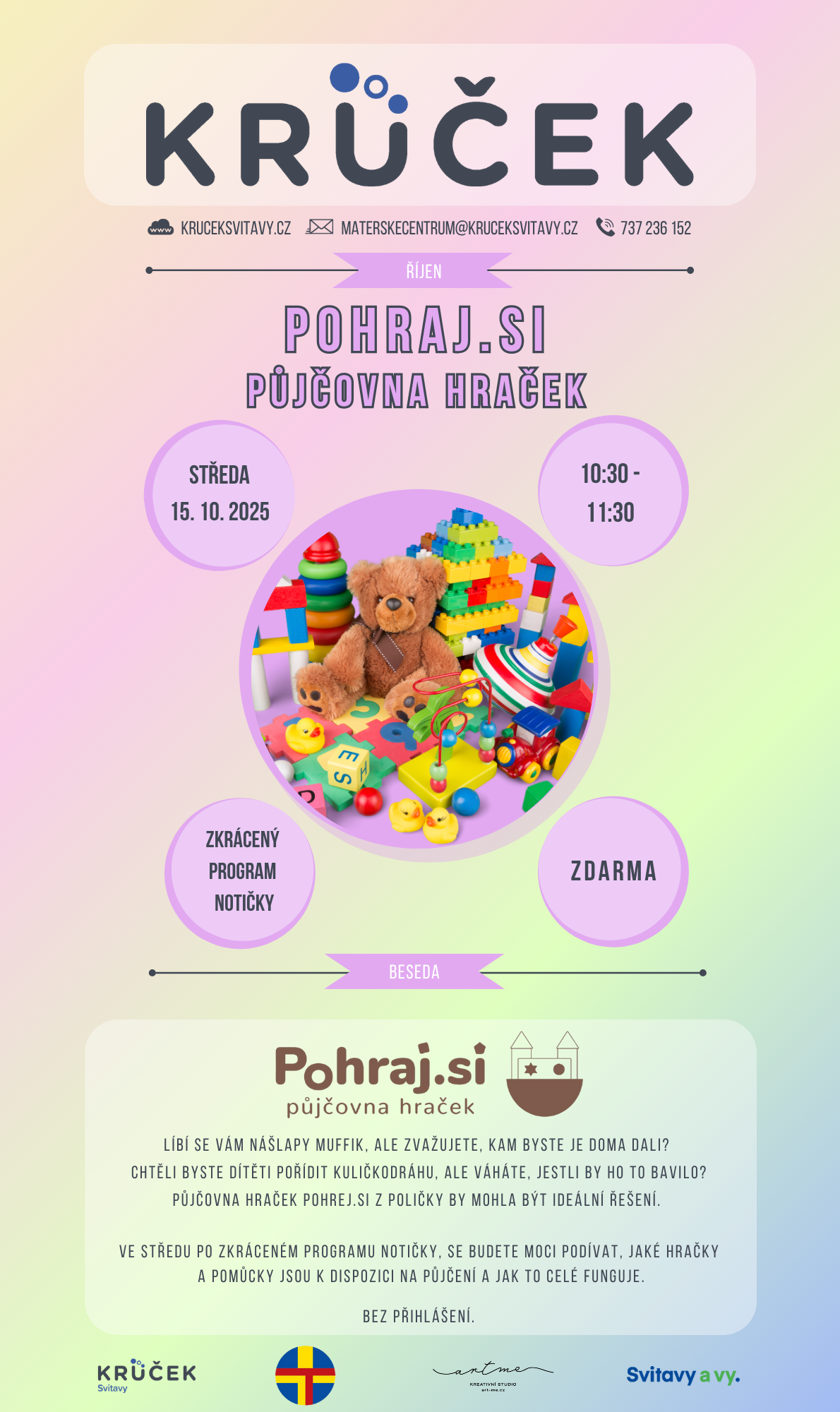 Zajímá vás, jak funguje půjčovna hraček Pohraj.si z Poličky? Přijďte se podívat na ukázku oblíbených pomůcek a hraček, které si můžete domů zapůjčit – od nášlapů Muffik až po kuličkodráhy a další vychytávky.