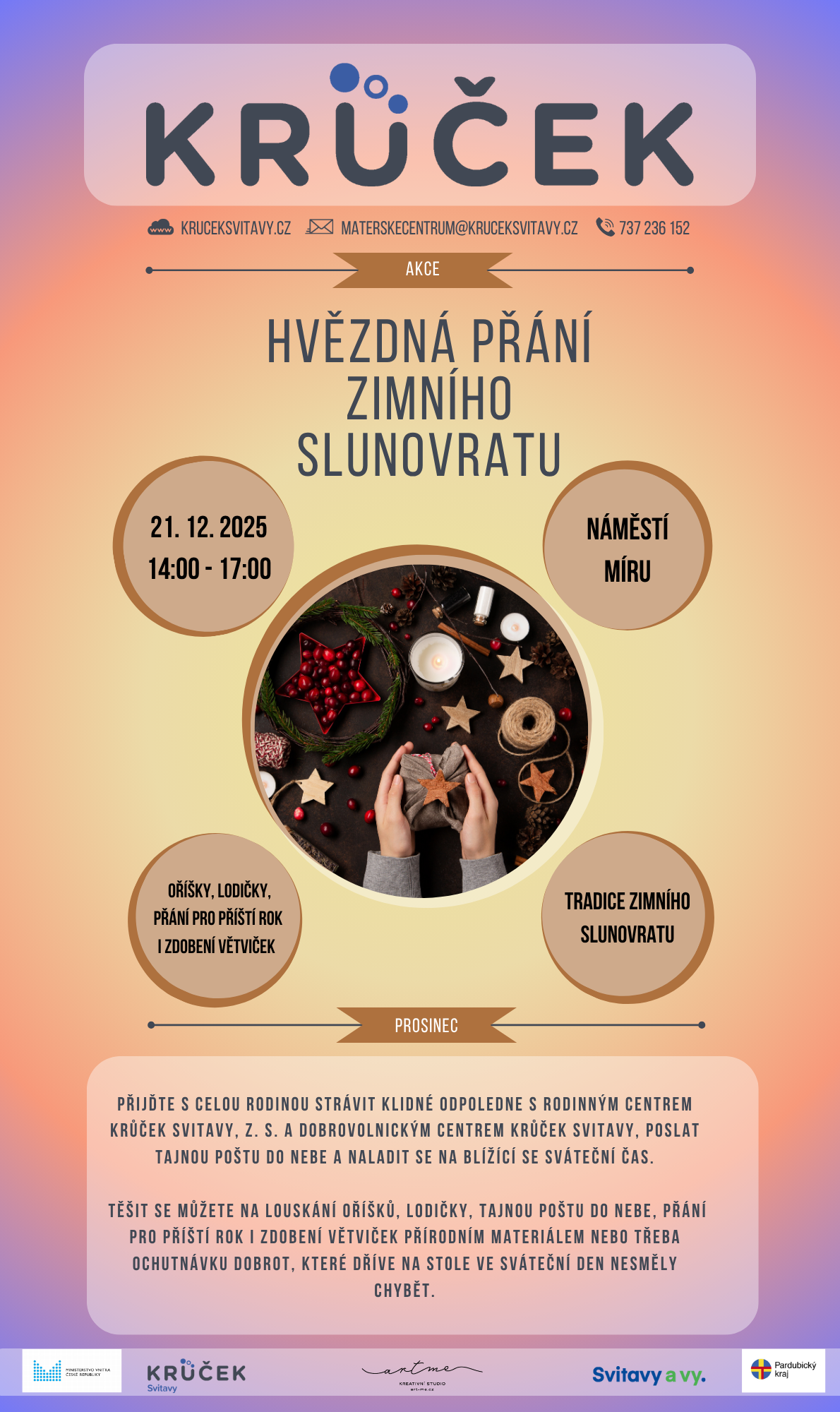 Přijďte s celou rodinou strávit klidné odpoledne s Rodinným centrem Krůček Svitavy, z. s. a Dobrovolnickým centrem Krůček Svitavy, poslat tajnou poštu do nebe a naladit se na blížící se sváteční čas.