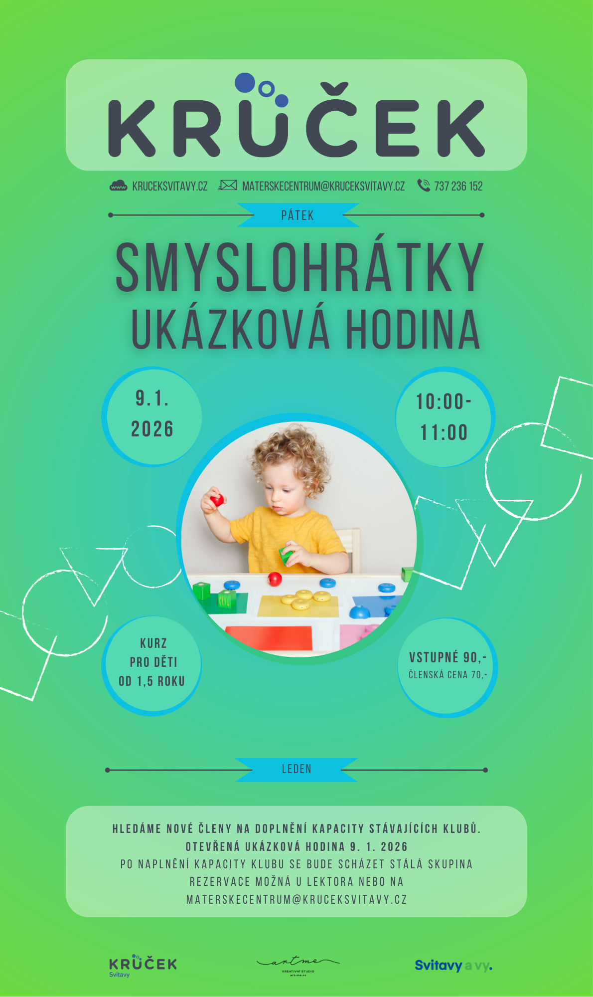 V pátek 9. 1. 2026 od 10:00 do 11:00 otevíráme ukázkovou hodinu Smyslohrátek – hravého klubu pro rodiče s dětmi od 1,5 roku, inspirovaného prvky Montessori pedagogiky.