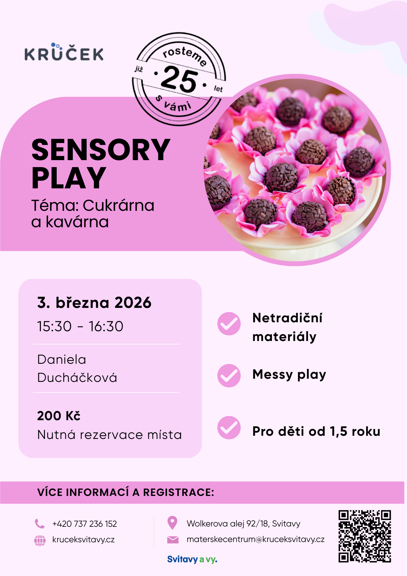 Zveme vás na voňavou a hravou lekci Sensory play, tentokrát na téma Cukrárna a kavárna. Děti si vyzkouší objevování různých materiálů, „pečení“, nabírání, přesypávání i kreativní hru na malé cukráře a baristy.