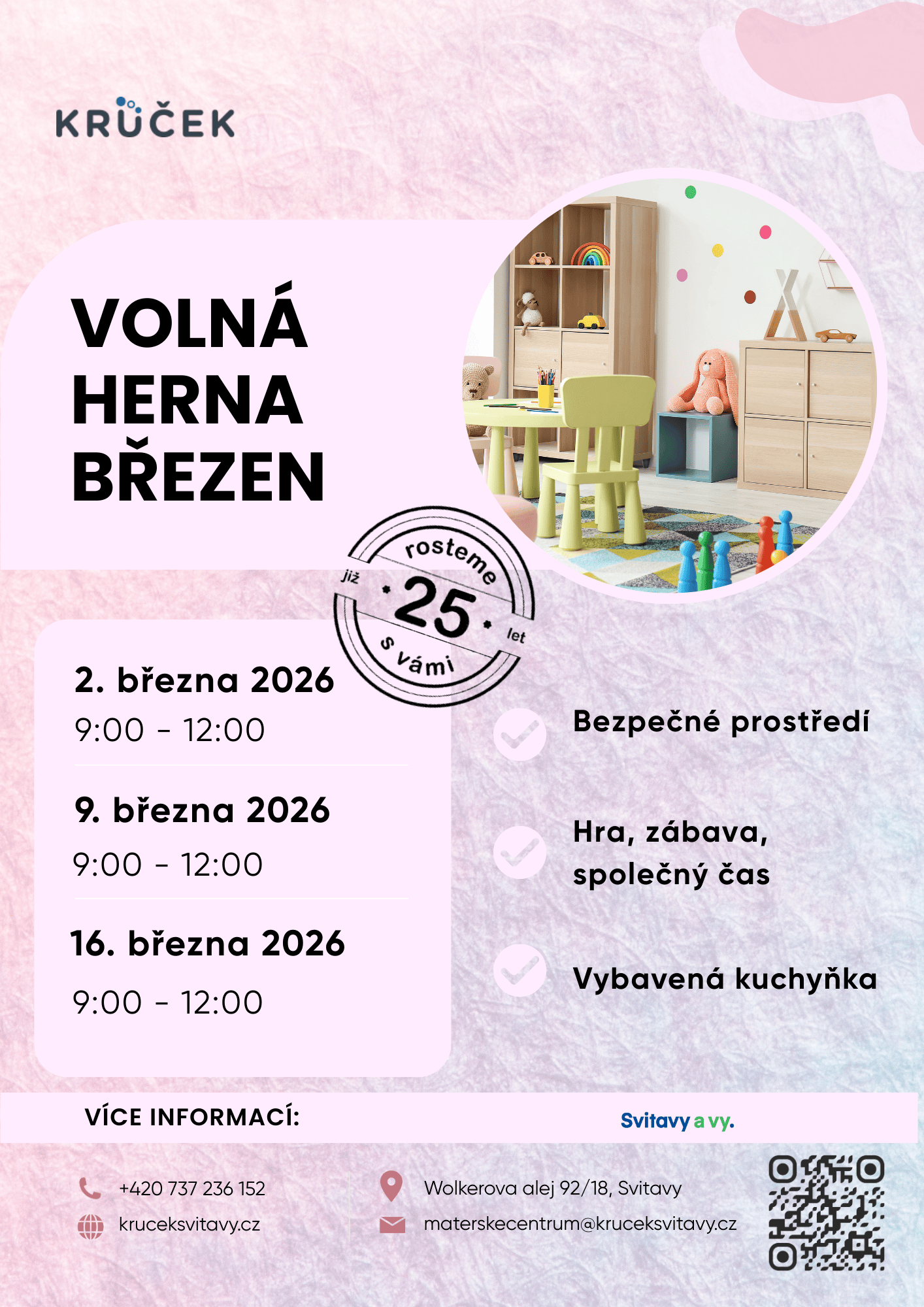 Herna je otevřená pro volnou hru, objevování i setkávání. K dispozici jsou hračky, prostor pro nejmenší i zázemí pro rodiče.