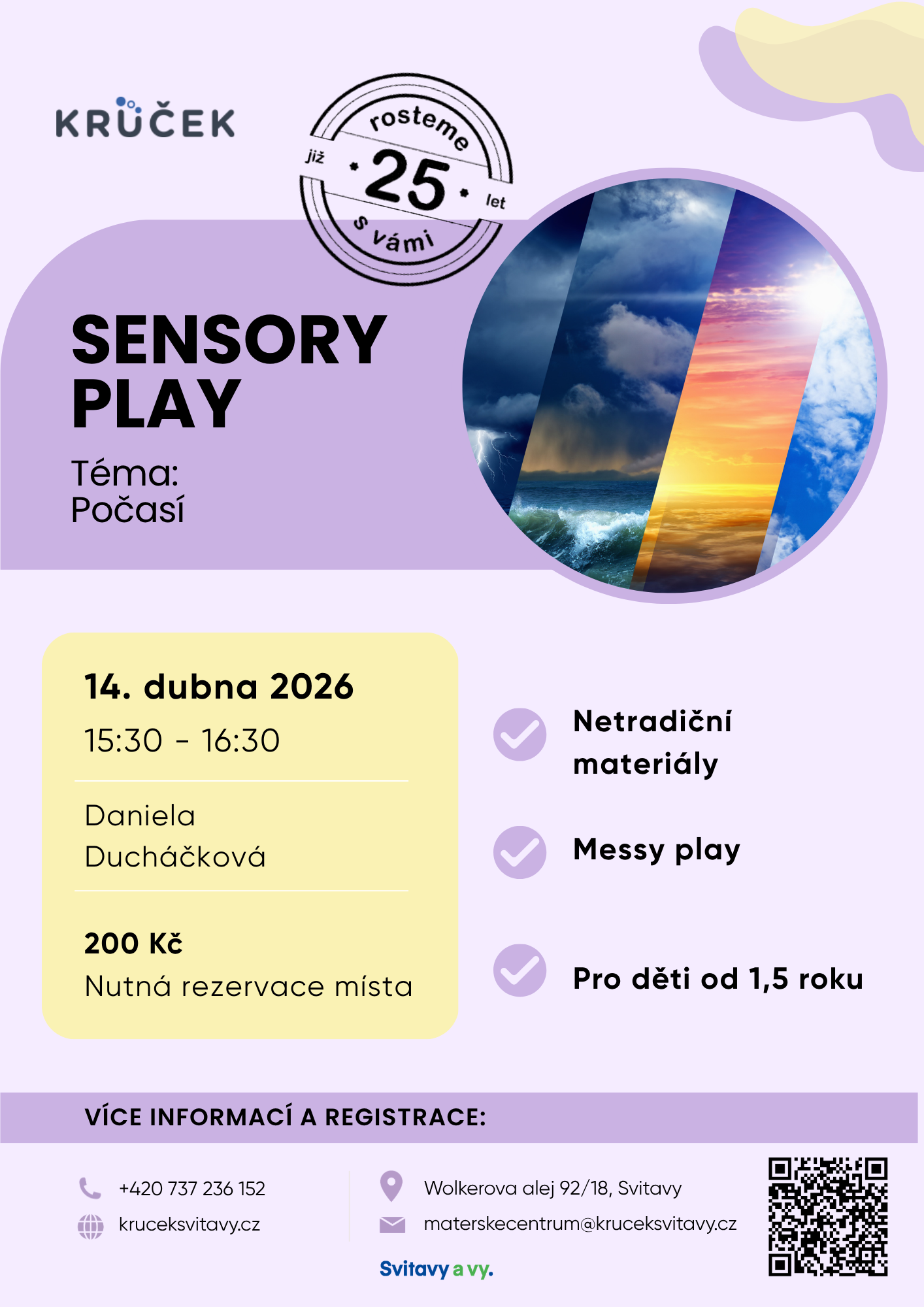 Přijďte s dětmi objevovat kouzlo počasí všemi smysly! Čekají vás hravá stanoviště inspirovaná deštěm, sluncem, větrem i mraky – plná barev, struktur a zábavných aktivit.