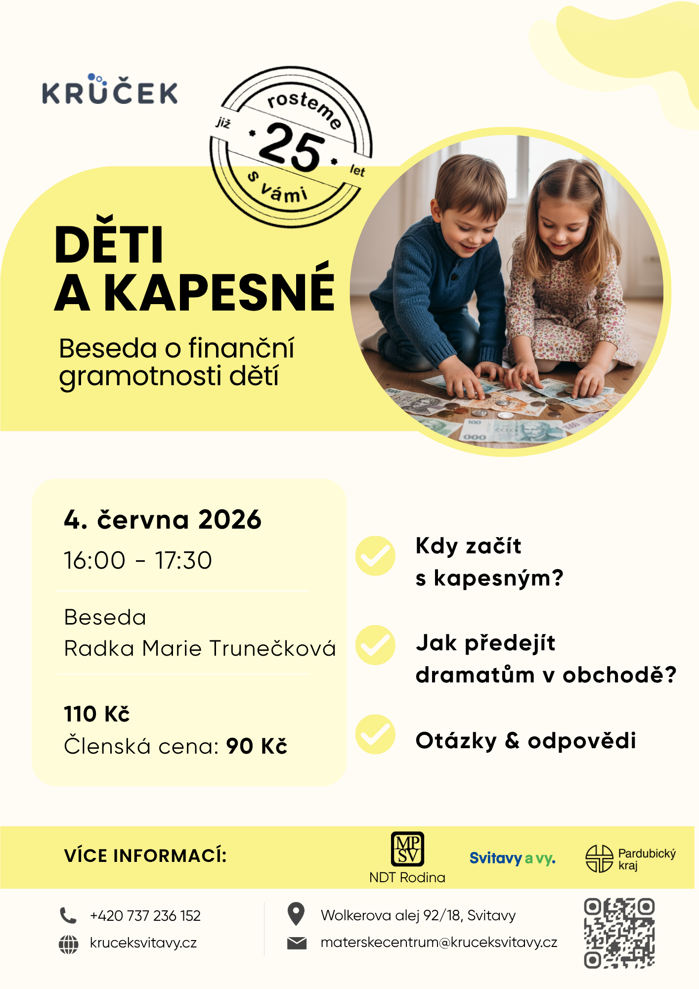 Přijďte na neformální besedu pro rodiče, kde budeme sdílet konkrétní zkušenosti a tipy, jak učit děti o penězích a nastavit kapesné tak, aby fungovalo v praxi. Besedu povede Radka Marie Trunečková - lektroka klubu Notička.